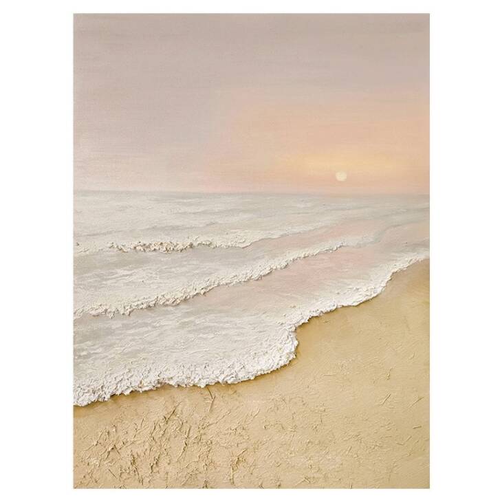 100% hand-painted “Whispers of Dawn” captures a serene beach sunrise in soft, muted tones. Gentle waves and warm light evoke calm and renewal, infusing any space with the peaceful beauty of morning.